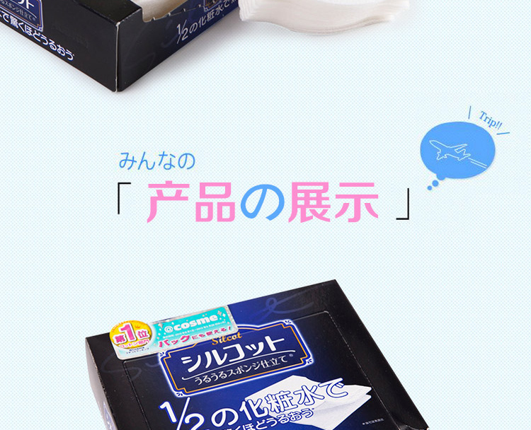 ●请不要用于化妆以外的用途。●不适合肌肤时,请停止使用。●本化妆棉用通常1/2量的化妆水就可以产生令人惊讶的润爽效果。●采用新开发的润滑海绵材料。●本化妆棉可以将化妆水完全送入肌肤,所以用通常1/2量的化妆水就可以从粉扑产生令人惊讶的润爽效果,能够用于轻拍皮肤、护肤。●极精细表面能够像黏在皮肤上一样贴紧肌肤,所以也推荐用于护肤。●而且配合了使肌肤触感变好的保湿成分。采用首创柔滑材料,能够呵护您的肌肤。【使用方法】●轻拍皮肤1.将大约通常一半量的化妆水在化妆棉表面展开。※注意不要使用过量化妆水。之后会溢出来。2.从与肌肤垂直方向轻柔地有节奏地轻拍皮肤使其渗入肌肤。●护肤轻拍皮肤后,以化妆水不足的地方为中心补充化妆水,沿打孔虚线将化妆棉一分为二,贴在担心的地方。※由于是2片1组,可以分开使用。进行揉搓会让化妆水更容易展开。※根据您的喜好,可以沿打孔虚线将化妆棉分开使用或一片一片地使用。